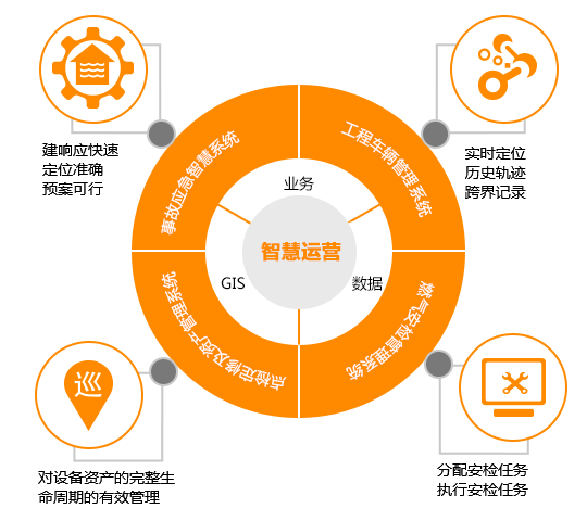 平台以“数据+地图+业务”为理念,构建基于管网GIS为基石,对管网设备进行监测、巡检、养护,保障设备安全平稳运行,及时发现、遏制管网运行问题。
