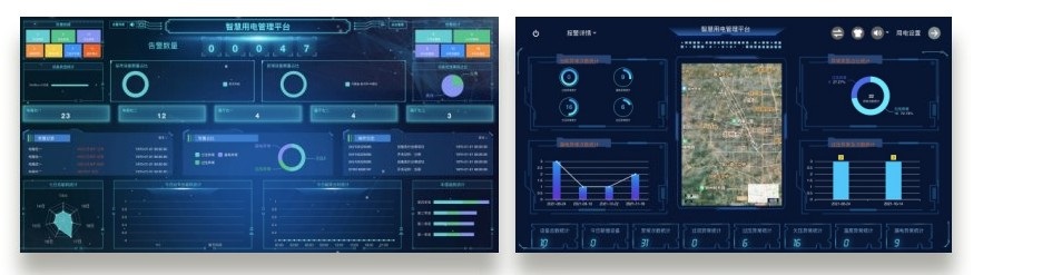 通过集中监控大屏,实时展示接入线路的用电数据、用电安全、设备在线运行状态、告警记录、告警占比、操作日志、能耗分析、能耗占比等图形和监控地理位置区域情况。